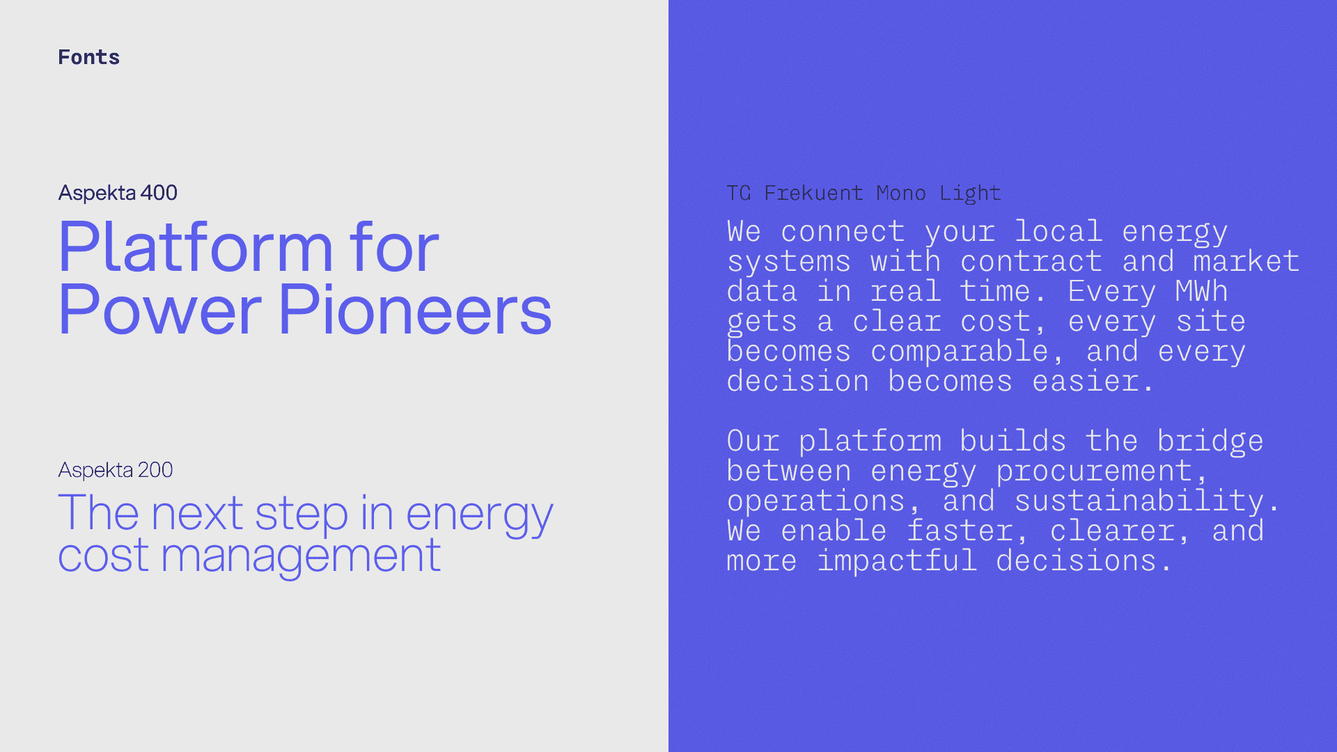 From grids and infrastructure to people and partnerships, the same energy connects them all. A colour palette centered on Companion’s energetic blue brings clarity, depth, and contrast across the identity. Typography combines Aspekta’s modern B2B character with TG Frekuent Mono, introducing a restrained industrial accent.